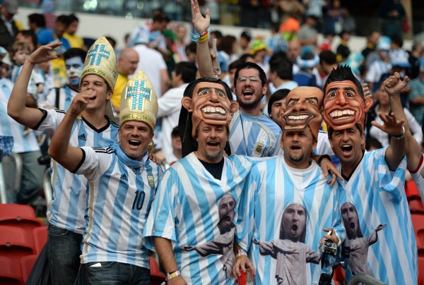 阿根廷球迷在場邊為自己的國家隊加油。(法新社)〔即時新聞/綜合報導〕開賽2分鐘,阿根廷中場狄馬力亞(Angel Di Maria)射門被奈及利亞門將擋下,前鋒梅西(Lionel Messi)跟進補射得分,阿根廷1比0平手。
