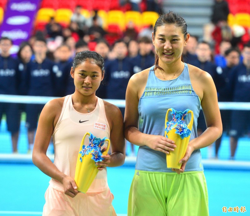 中國選手段瑩瑩(左)、王雅繁(右)首度在台灣女網封后。(記者王藝菘攝)
