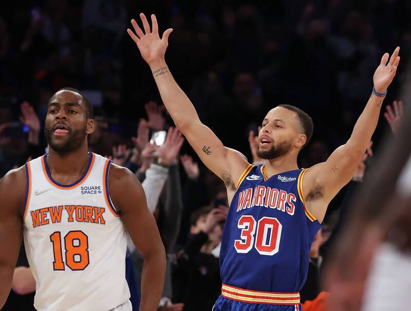 柯瑞單場投進5顆三分球攻下22分,生涯三分球總數超越了傳奇射手「雷槍」艾倫,成為史上生涯最多三分球紀錄的保持人。(法新社)