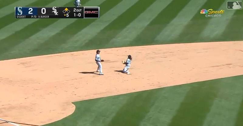 接著安格爾再敲出捕手前的飛球,這次換捕手完全接不到,安格爾直接跑到二壘進佔得點圈,同個半局,下棒的柏格(Jake Burger)再度敲出內野高飛球,怪風又再次讓球吹到水手內野無人能夠判斷的地方,最終該球落地,白襪也因此追回1分,該球甚至沒有被記成失誤,而是內野安打外帶1分打點。