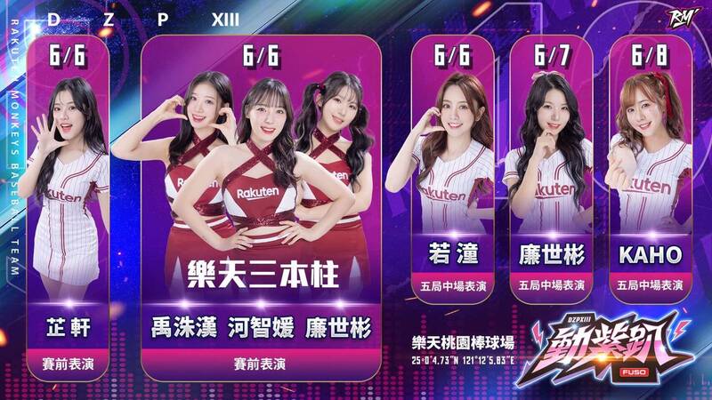 「FUSO動紫趴」樂天女孩表演名單正式曝光,6月6日開幕日將由Rap擔當ZX芷軒率先登場,攜手師弟師妹組成的唱跳團體Fairy X一起亮相,緊接著登場的是「韓援三本柱」廉世彬、河智媛與禹洙漢合體,三人首度挑戰中文歌曲,中場由實力派歌姬若潼接棒演出。