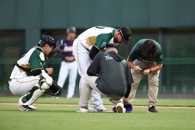 台鋼雄鷹投手後勁登板投球前就出現插曲,遭對方抗議釘鞋顏色,因此多花了點時間才正式登板。(台鋼雄鷹提供)