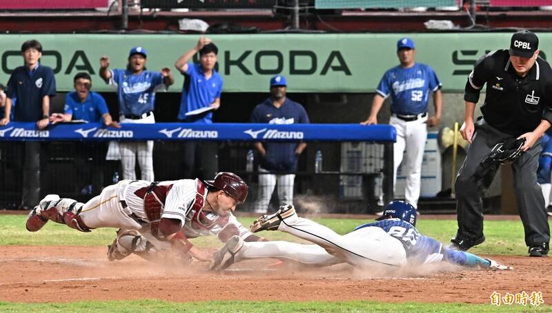 樂天桃猿張閔勛(左)本壘前觸殺富邦悍將劉俊豪(右)。(記者陳志曲攝)
