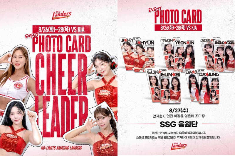韓職「SSG 登陸者」昨在Instagram發文表示,將於本月26日至28日推出限定販售的啦啦隊的小卡,每張售價為5000韓元(約新台幣109元),主角包括安芝儇、趙娟週、金渡兒和裴垂鉉等4位知名啦啦隊員。