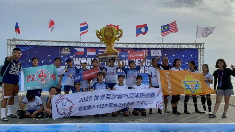 〔記者甘孟霖/台北報導〕台北市碧湖國小、古亭國小選手組成巧固球台灣代表隊,赴泰國參加「2025年世界盃青少年沙灘巧固球錦標賽」,迎戰泰國、香港,最終三連勝成為世界冠軍,寫下榮耀新頁,這也是碧湖國小巧固球創隊三十年來首度踏上國際賽場。