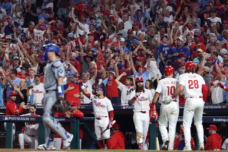 費城人今在國聯分區賽G2以3:4不敵道奇,苦吞2連敗陷入淘汰邊緣。(法新社)