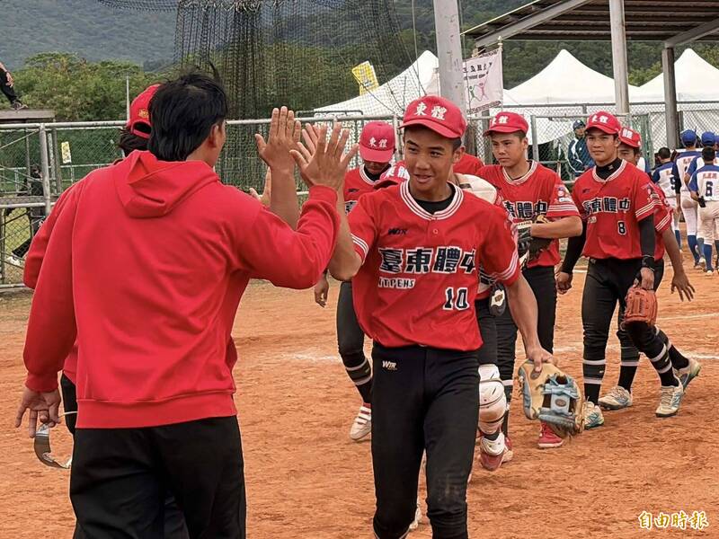 台東體中獲得第32屆關懷盃青少棒組冠軍,林恩(右)與教練團擊掌。(記者徐正揚攝)