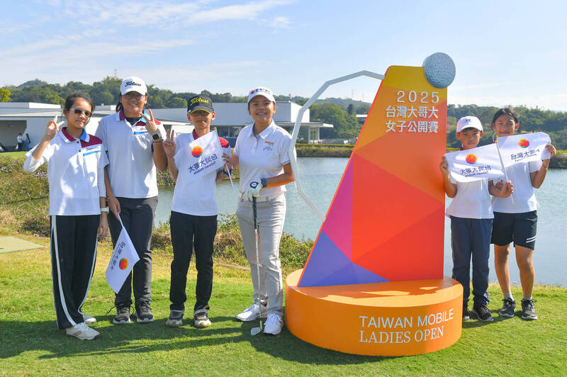 台中太平區頭汴國小的5位高球社團學生,今天特別前來台豐球場為包括徐薇淩(左4)在內的球星加油打氣。(台灣大哥大女子公開賽提供)