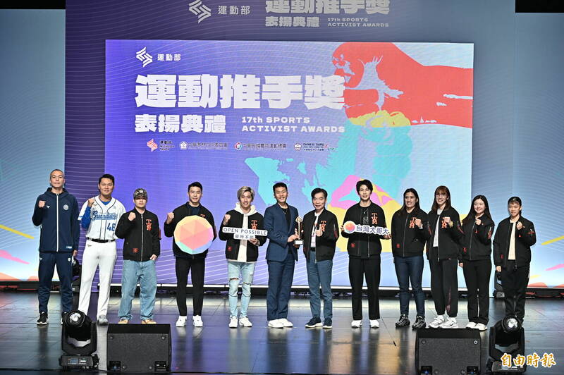 台灣大哥大獲得運動推手獎贊助類金質獎,富邦勇士蔡文誠(左一)、富邦悍將范國宸(左二)、女子拳擊好手林郁婷(右五)、陳念琴(右四)、黃筱雯(右三)等人9日出席與運動部長李洋台上合影。(記者塗建榮攝)