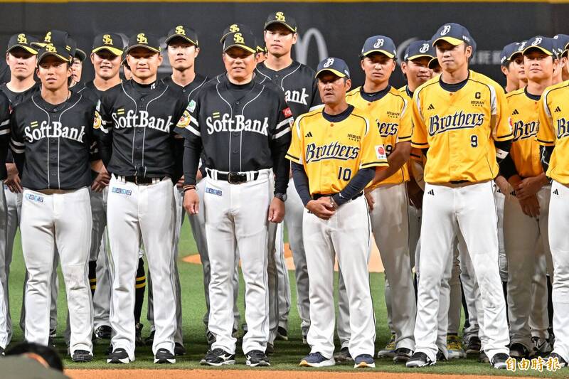 兩隊球員賽前合影,福岡軟銀鷹徐若熙(前排左三)被安排到監督小久保裕紀旁。(記者陳志曲攝)