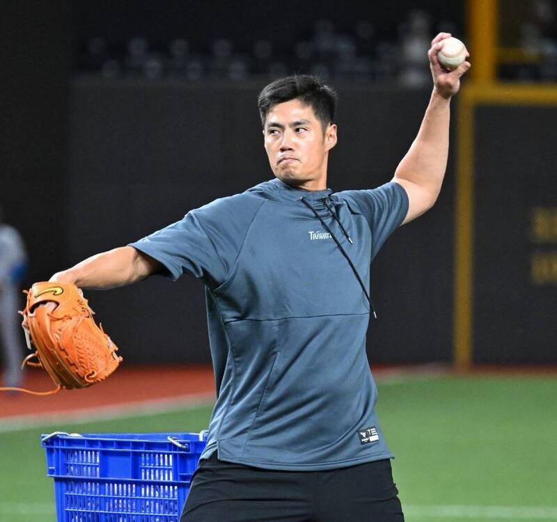 陳偉殷擔任餵球投手。(記者陳逸寬攝)