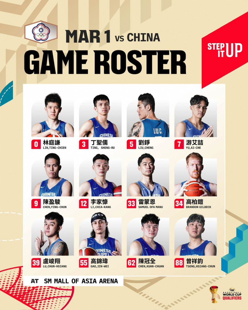 台灣隊明天對決中國的12人名單為陳盈駿、林庭謙、高錦瑋、丁聖儒、游艾喆、李家慷、劉錚、盧峻翔、雷蒙恩、曾祥鈞、陳冠全、高柏鎧。