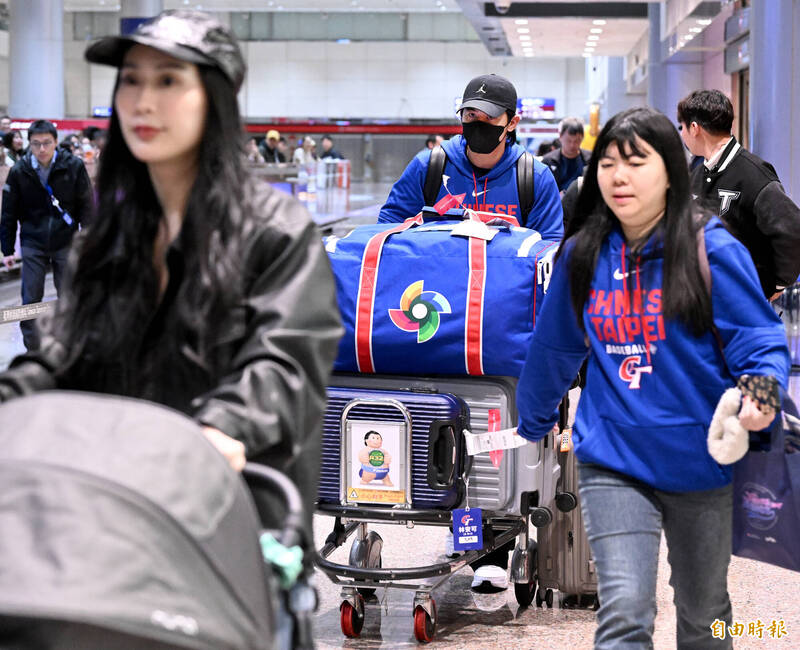 〔記者林宥辰/桃園機場報導〕台灣隊今凌晨抵達台灣,選手、教練陸續走出接機大廳,「國防部長」張育成走出時,收到熱烈歡迎。