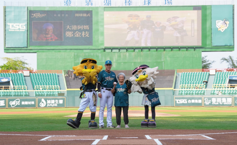 大港阿嬤來台鋼主場開球。(台鋼雄鷹提供)