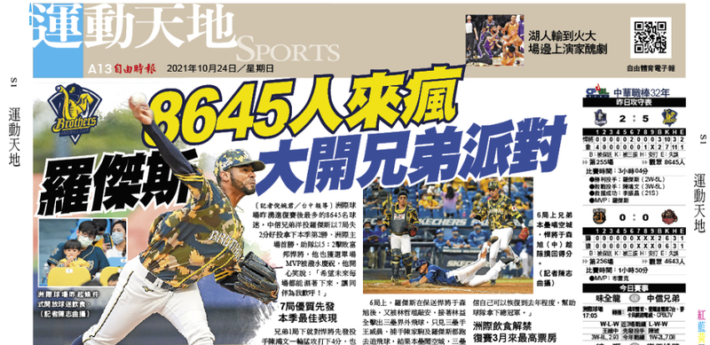 8645人來瘋 羅傑斯大開兄弟派對6局上兄弟本壘唱空城,悍將于森旭(中)趁隙撲回得分。