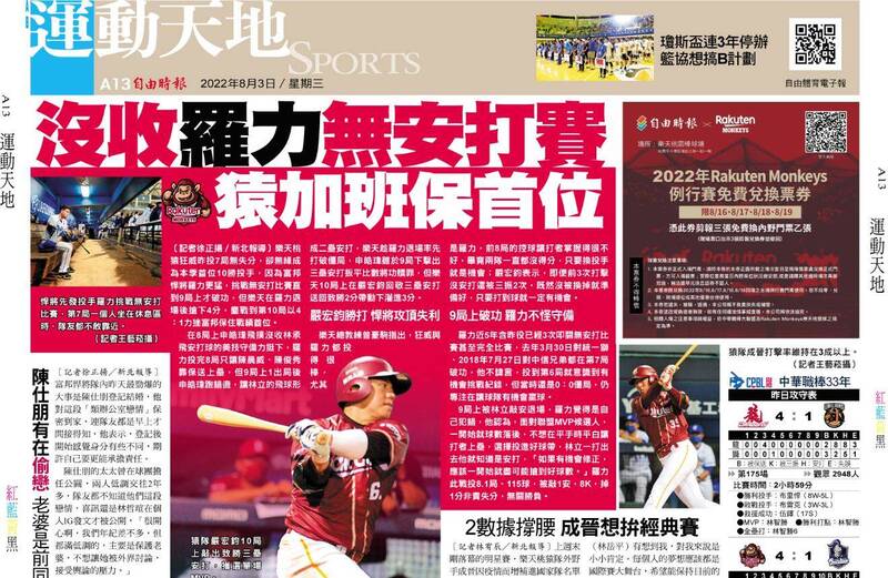 〔記者徐正揚/新北報導〕樂天桃猿狂威昨投7局無失分,卻無緣成為本季首位10勝投手,因為富邦悍將羅力更猛,挑戰無安打比賽直到9局上才破功,但樂天在羅力退場後搶下4分,鏖戰到第10局以4:1力挫富邦保住戰績首位。