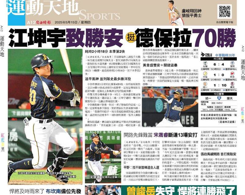 中信昨賽前1分差的比賽僅4勝9敗,但昨展現韌性,並以16勝15敗成功保住5成勝率。這也是德保拉生涯第70勝,在隊史上和風神並列洋投最多勝。