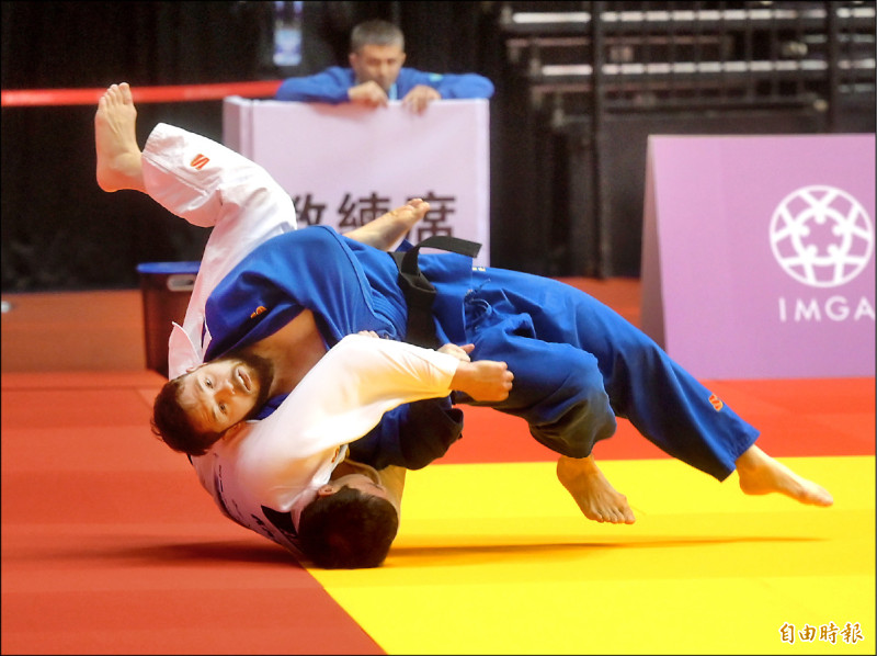 世壯運柔道比賽法國選手盧卡斯(藍衣)。(記者王藝菘攝)
