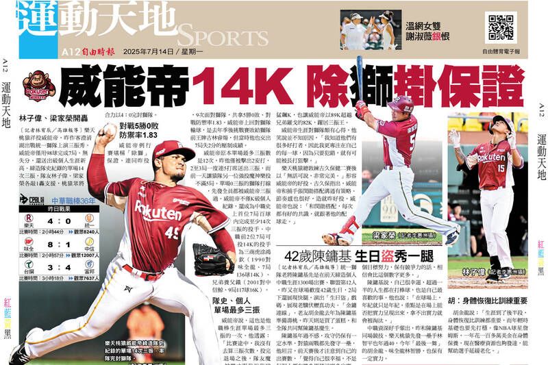 〔記者林宥辰/高雄報導〕樂天桃猿洋投威能帝,昨作客澄清湖出戰統一獅隊上演三振秀。威能帝僅用98球完成7局、無失分,還送出破個人生涯新高、締造隊史紀錄的單場14次三振,隊友林子偉、梁家榮各敲1轟支援,桃猿眾將合力以4:0完封獅隊。