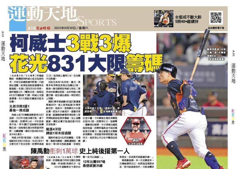 柯威士昨第3度登板,先發1.2局被敲8安另有2次保送,失8分其中7分責失吞下來台首敗,防禦率高達15.26、每局被上壘率3.26,完全壓不住陣腳。