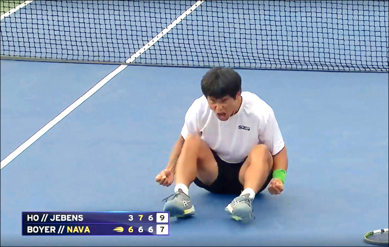 何承叡在美網男雙首輪戲劇性逆轉晉級,贏球瞬間激動的坐在地上慶祝。(取自官網)