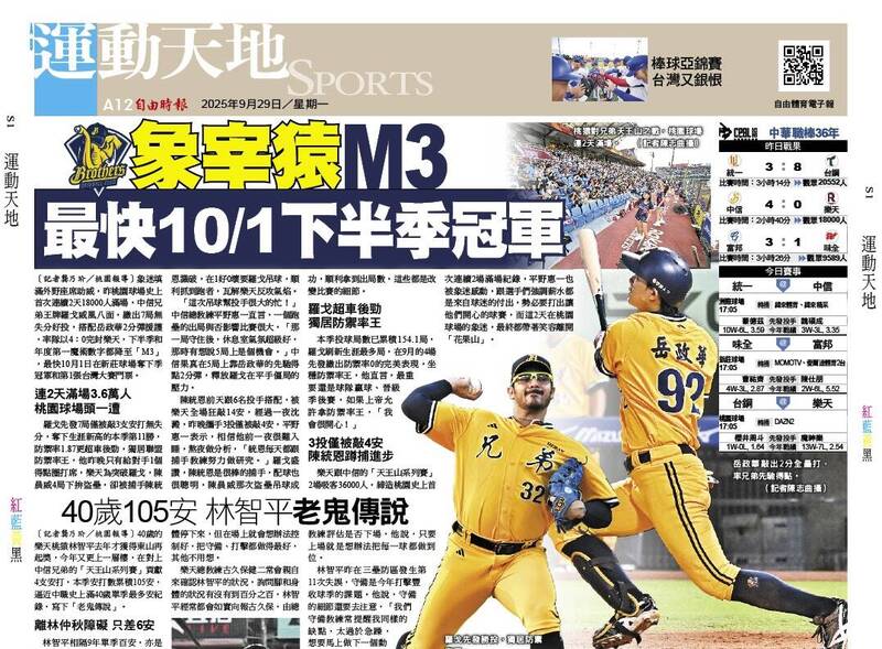 〔記者龔乃玠/桃園報導〕象迷填滿外野座席助威,昨桃園球場史上首次連續2天18000人滿場,中信兄弟王牌羅戈威風八面,繳出7局無失分好投,搭配岳政華2分彈援護,率隊以4:0完封樂天,下半季和年度第一魔術數字都降至「M3」,最快10月1日在新莊球場奪下季冠軍和第1張台灣大賽門票。