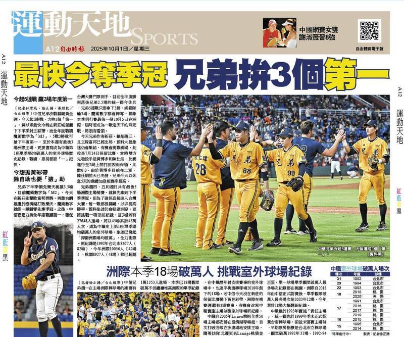 〔記者林宥辰、徐正揚、黃照敦/台北報導〕中信兄弟決戰關鍵黃金週,今天起5連戰,力拚3個「第一」。黃衫軍最快今晚在新莊城堡灑下下半季封王綵帶,而全年度戰績魔術數字為「M3」,5戰3勝就可搶下年度第一,至於本週有最後3場洲際主場,更要書寫成為中職第1座單季場均破萬人的室外球場歷史紀錄,戰績、票房都要「一」把抓。