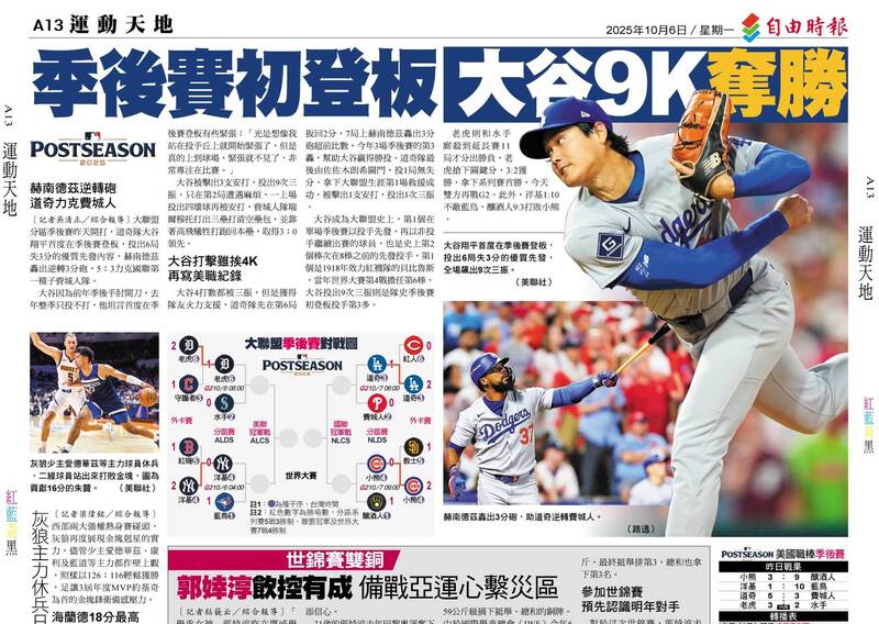 〔記者吳清正/綜合報導〕大聯盟分區季後賽昨天開打,道奇隊大谷翔平首度在季後賽登板,投出6局失3分的優質先發內容,無關勝負,赫南德茲轟出逆轉3分砲,5:3力克國聯第一種子費城人隊。