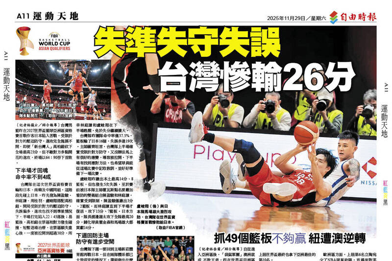 〔記者粘藐云/綜合報導〕台灣男籃昨在2027世界盃籃球亞洲區資格賽首戰作客日本陷入苦戰,受限於對方的壓迫防守,進攻完全施展不開,即便「新台灣人」高柏鎧砍下全場最高23分,但不敵對方多點開花的進攻,終場以64:90吞下首敗。