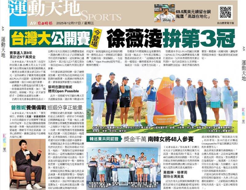 〔記者粘藐云/彰化報導〕台巡年終封關大賽-台灣大哥大女子公開賽今在台豐高爾夫俱樂部點燃戰火,總獎金加碼至賽史新高的1千萬元,並與南韓女子職業高球巡迴賽(KLPGA)共同認證,從區域賽升級成國際賽,吸引108位選手參賽。