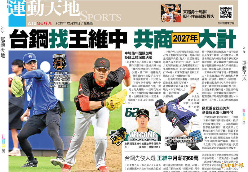 〔記者龔乃玠/新聞分析〕台鋼雄鷹昨天跟王維中達成共識,統一獅和味全龍則分別找來江少慶、曾仁和,過往有先發實績的本土投手在今年季後詢問度高,不只是為了明年球季備戰,後年中職有可能做出例行賽「加場」的大轉變。一旦場次增加,本土先發的深度會越來越重要,台鋼找來王維中正是未雨綢繆,並非只看1個球季。