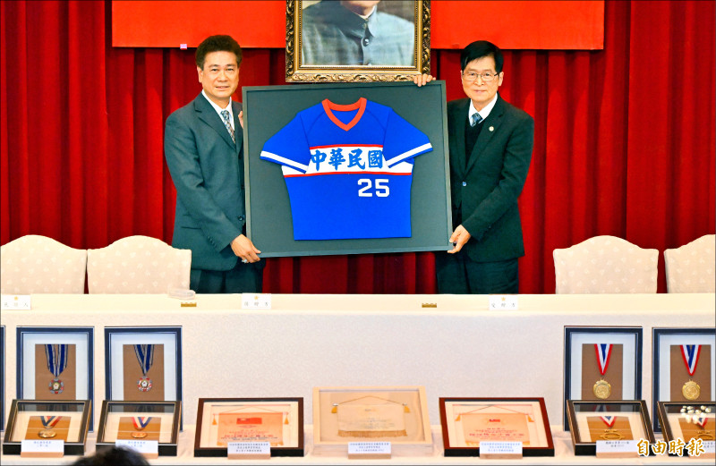 陳義信(左)捐贈棒球文物給退輔會,由主委嚴德發(右)代表接受。(記者林正堃攝)