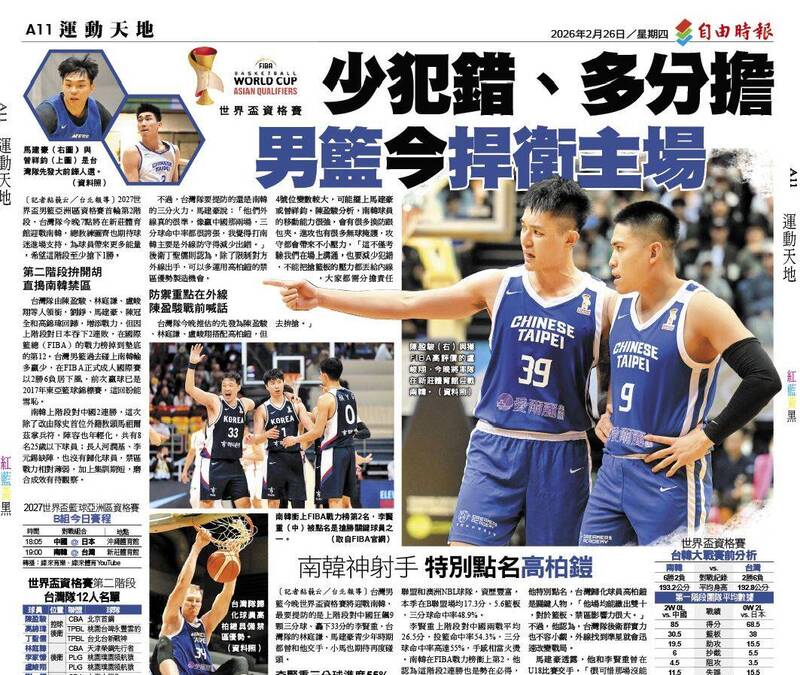 不過,台灣隊要提防的還是南韓的三分火力,馬建豪說:「他們外線真的很準,像贏中國那兩場,三分球命中率都很誇張,我覺得打南韓主要是外線防守得減少出錯。」後衛丁聖儒則認為,除了限制對方外線出手,可以多運用高柏鎧的禁區優勢製造機會。