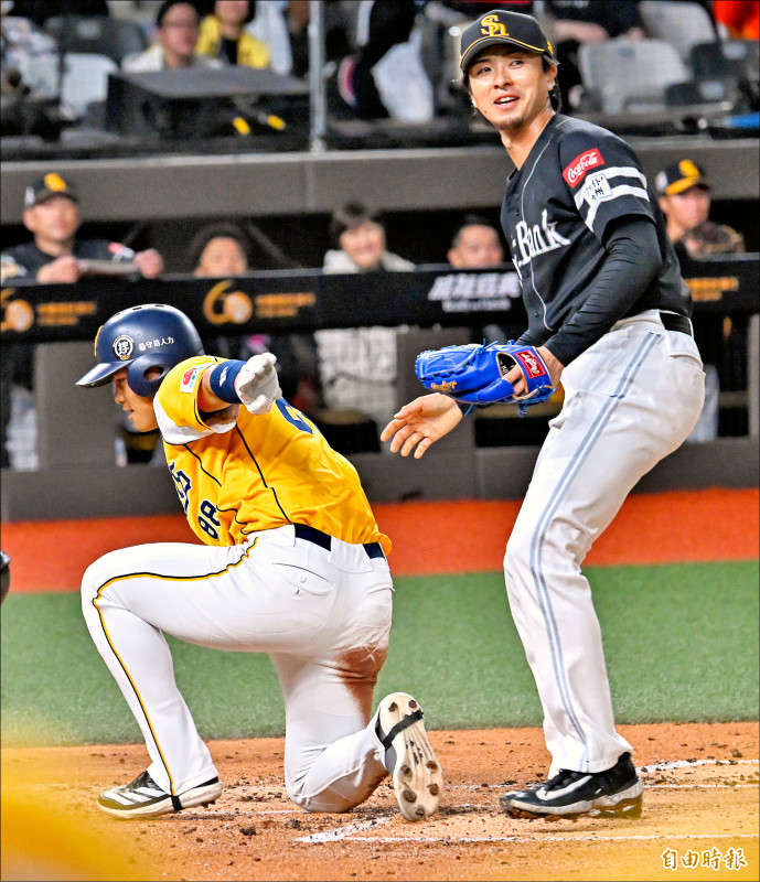 台日交流賽1局下,軟銀先發投手上澤直之(右)補位本壘觸殺不及,宋晟睿跑回兄弟第1分。(記者陳志曲攝)