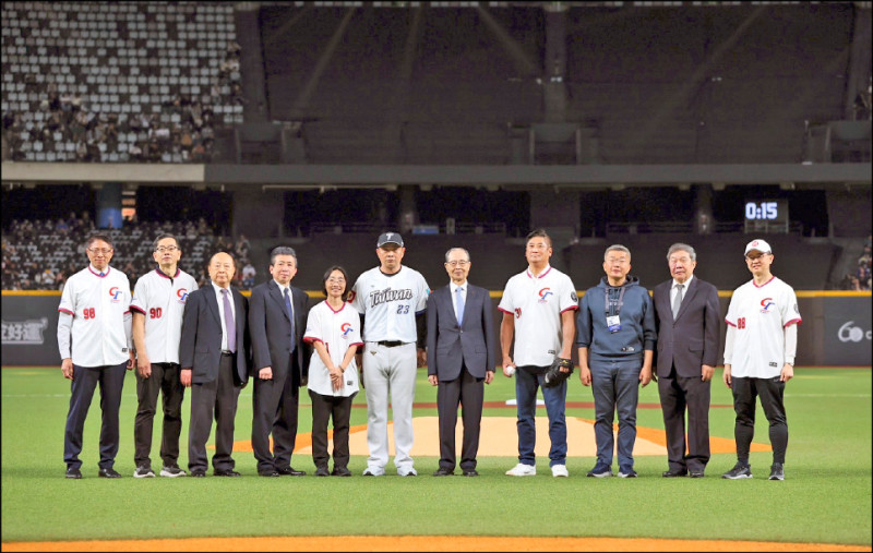王貞治(右五)擔任台日交流賽開球嘉賓,與棒協理事長辜仲諒(右四)等人在大巨蛋場中合影。(中國信託提供)