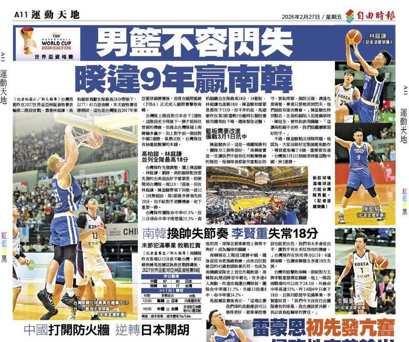 〔記者粘藐云/新北報導〕台灣男籃昨在2027世界盃亞洲區資格賽首輪第二階段首戰,靠著林庭謙、高柏鎧皆貢獻全隊最高18分帶領下,以77:65力退南韓,本次資格賽首勝開胡,這也是台灣隊自2017年東亞籃球錦標賽後,首度在國際籃總(FIBA)正式成人國際賽擊敗南韓。