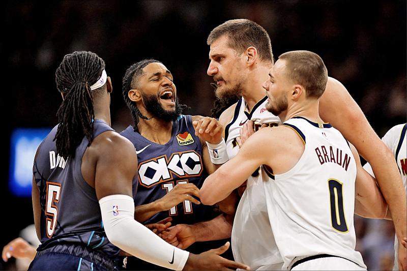 金塊約基奇(右二)數度被雷霆的剽悍防守激怒。