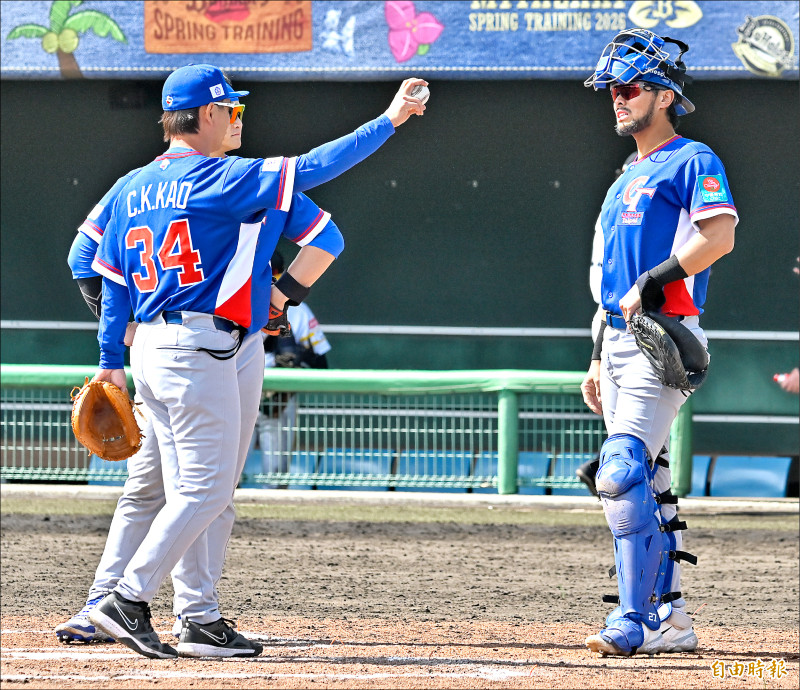 台灣隊捕手教練高志綱(左)賽後找林家正(右)特訓。(特派記者陳志曲攝)