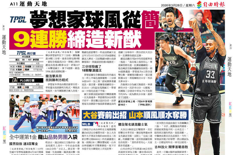 〔記者吳孟儒/綜合報導〕 福爾摩沙夢想家昨狂下三分雨,團隊轟進18顆三分球,湯普金斯包辦5顆,豪取全場最高23分,替補上陣的盧冠良投進4顆拿16分,終場107:90擊退國王,拿下9連勝,締造TPBL最長連勝紀錄。