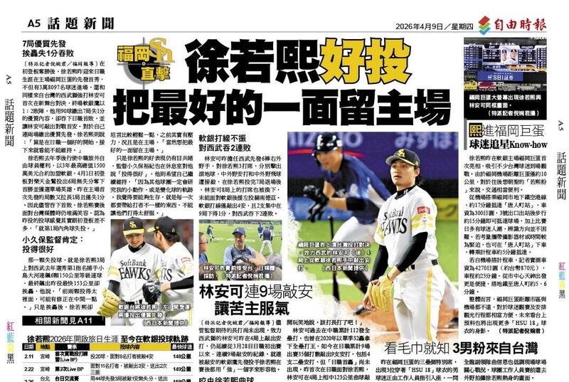 徐若熙去年季後行使中職旅外自由球員權利,以3年最高總值1500萬美元合約加盟軟銀,4月1日初登板對樂天金鷲投出6局無失分奪下首勝並獲選單場英雄,昨在主場首次先發的局數又拉長1局且僅失1分。因此儘管吞下首敗,徐若熙賽後面對台灣媒體時仍堆滿笑容,認為昨役的投球感覺其實跟初登板差不多,「就第1局內角球失投。」