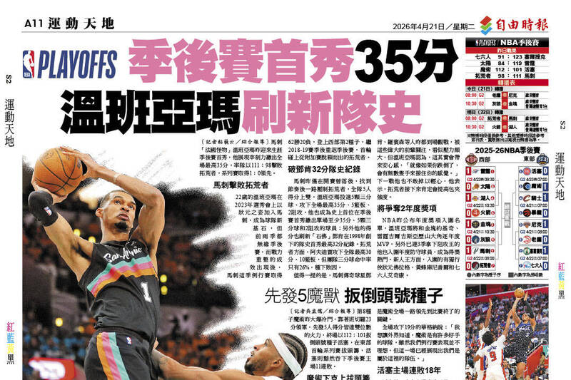 值得一提的是,馬刺傳奇球星鄧肯、羅賓森等人昨都到場觀戰,被這些偉大的前輩關注,看似壓力頗大,但溫班亞瑪認為,這其實會帶來安心感,「就像如果你跌倒了,會有無數隻手來接住你的感覺。」下一戰他也不敢掉以輕心,他表示,拓荒者接下來肯定會提高包夾強度。