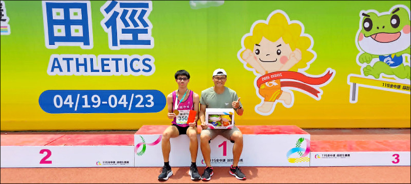 陳建愷(左)在全中運國男組跳高打破28年大會紀錄,圖右為教練張日銘。